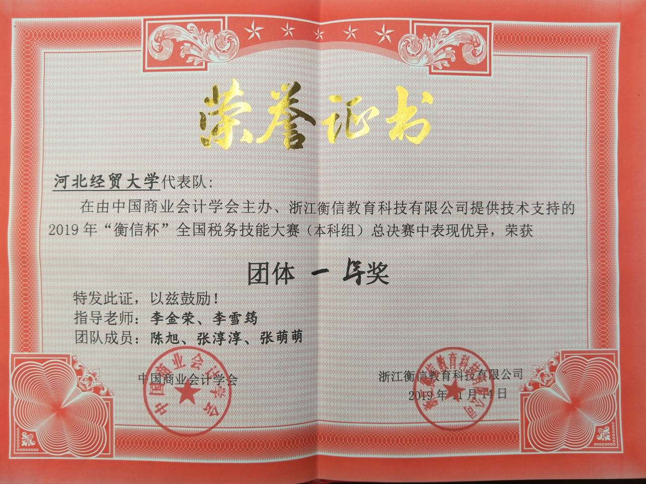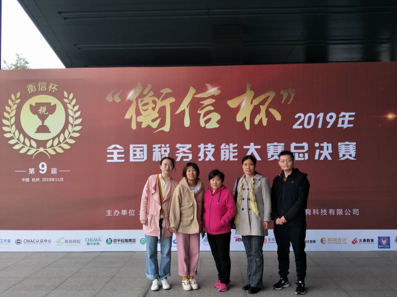 11月11—14日, 2019年“衡信杯”全国税务技能大赛总决赛在杭州举行,bg大游官方网站代表队在本次比赛中荣获团体一等奖,张淳淳同学获得个人三等奖。张淳淳、陈旭、张萌萌同学获得衡信科技教育有限公司免试入职通知书。李金荣老师荣获优秀指导教师称号,李雪筠老师荣获优秀带队教师称号。