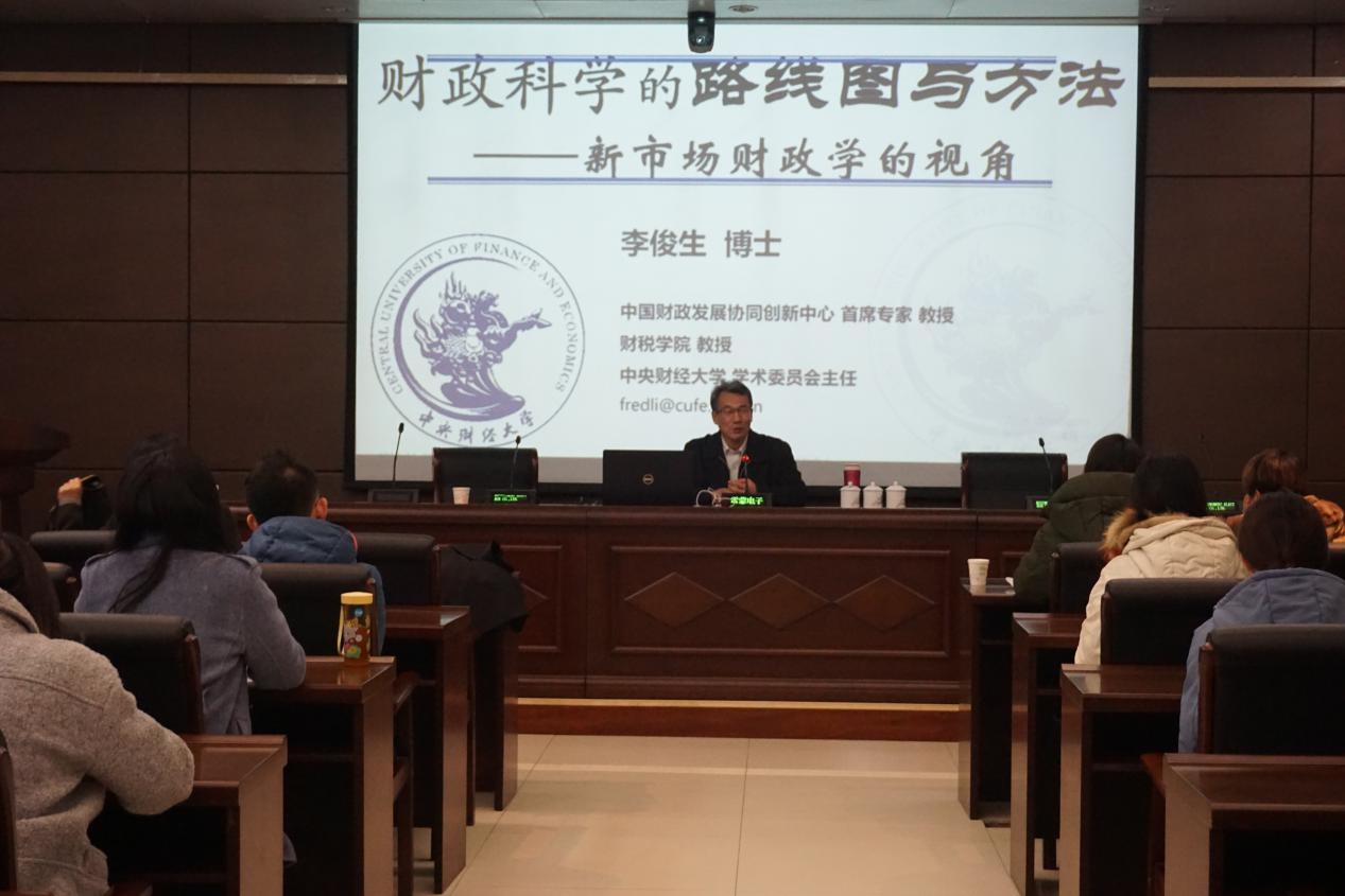 11月18日,中央财经大学李俊生教授应bg大游官方网站邀请于第三会议室作题为“财政科学的路线图与方法——新市场财政学的视角”的学术报告,财税公司经理王晓洁主持,公司部分师生共100余人聆听了报告。