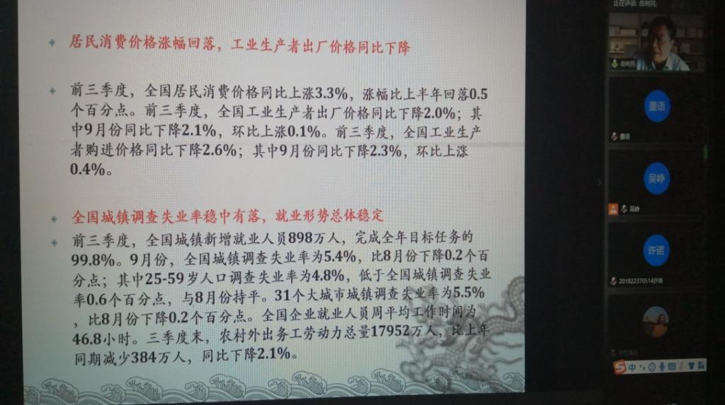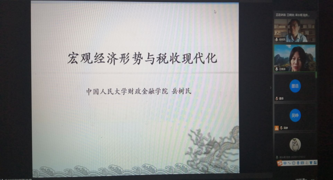 10月19日下午,中国人民大学博士生导师岳树民教授应bg大游官方网站邀请,通过腾讯会议平台为同学们作题为“当前宏观经济形势与税收政策”的主题报告。本次报告由王晓洁经理主持,仇晓洁副经理做点评,bg大游官方网站部分师生200余人在线聆听了本次报告。