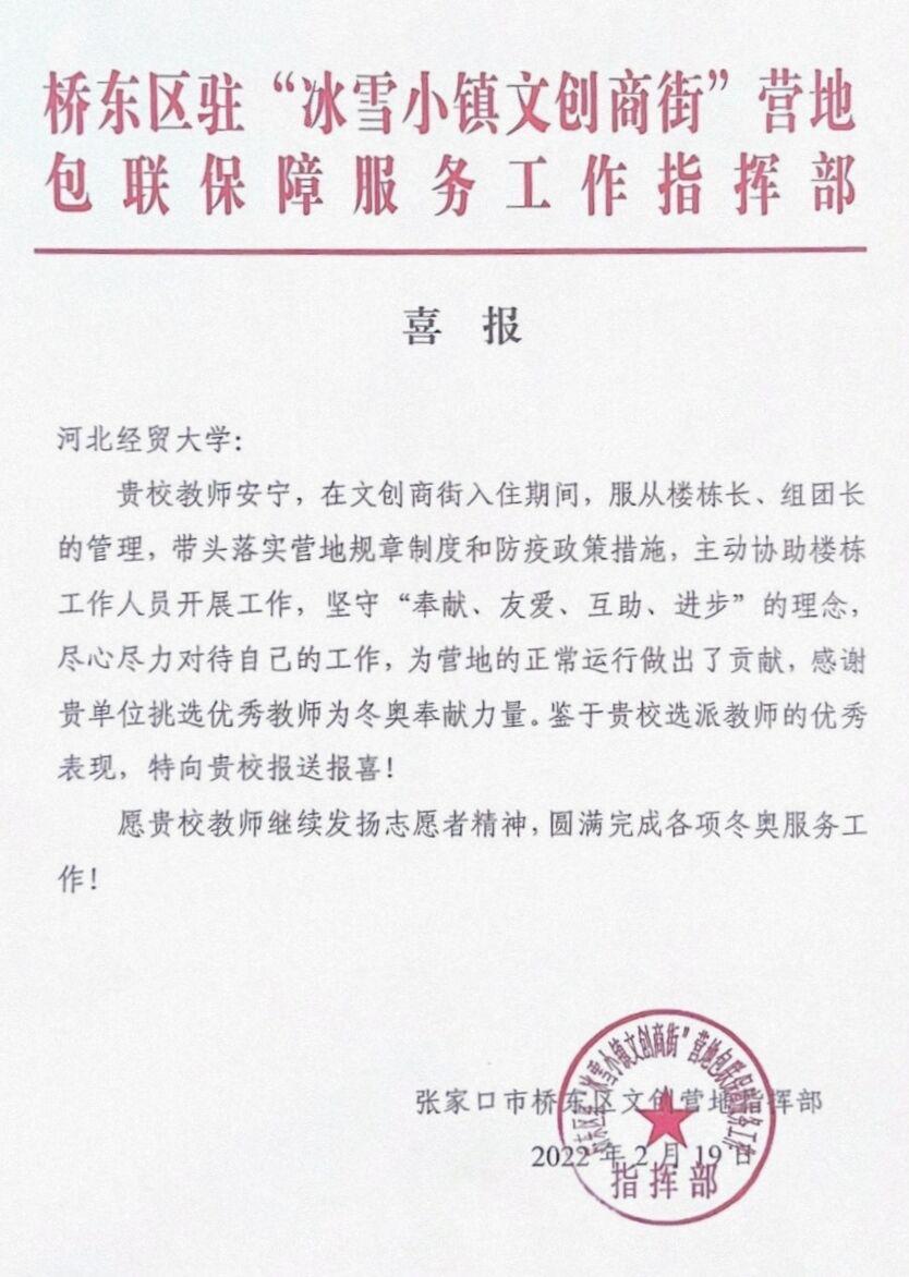 近日,张家口桥东区文创营地指挥部发来喜报,对公司教师志愿者安宁在冬奥会志愿服务期间做出的贡献进行表彰。