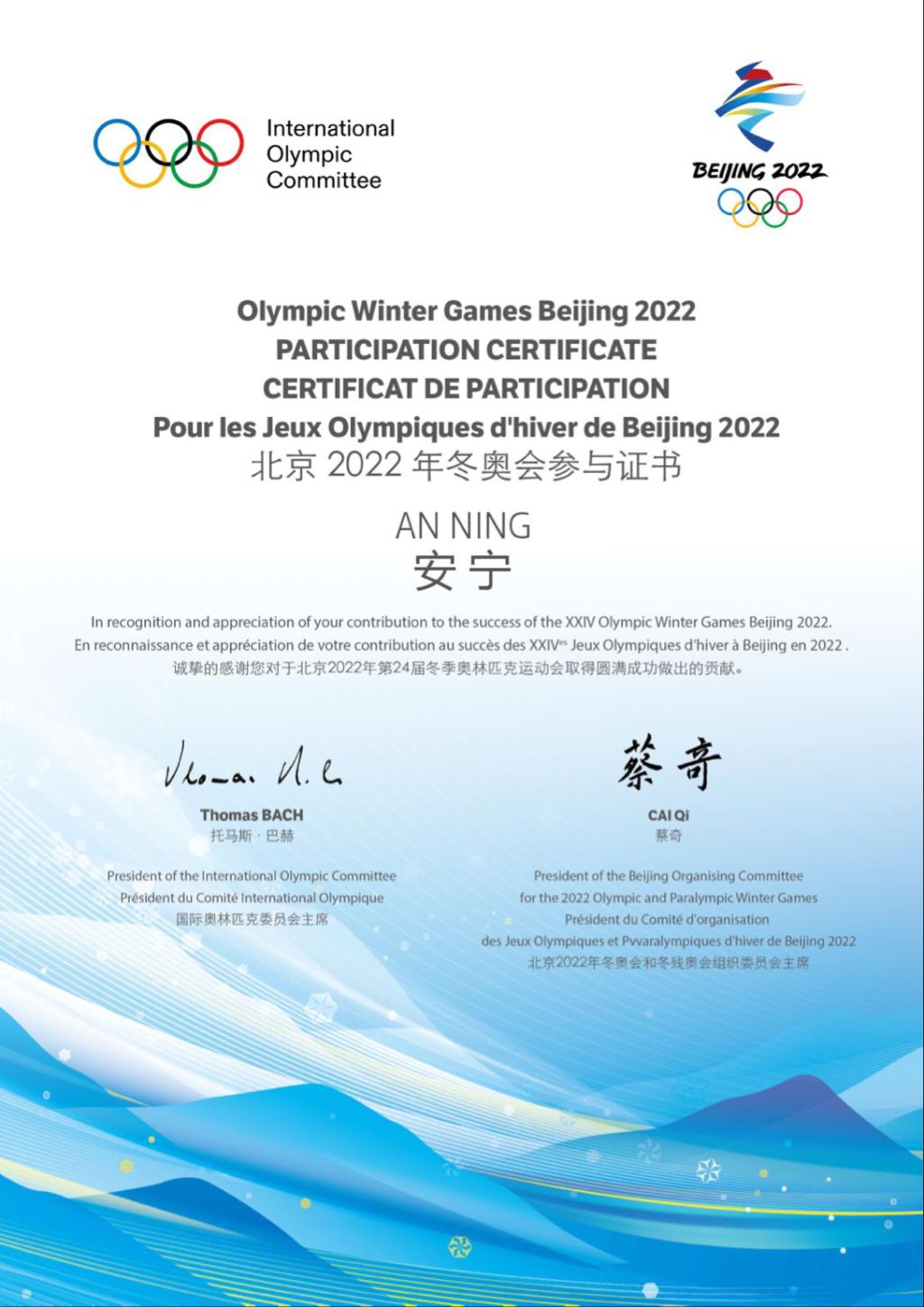 1月25日至2月20日,安宁担任北京2022年冬奥会张家口赛区国家跳台滑雪中心志愿者激励助理,带领公司34名员工志愿者在文创上街驻地开展冬奥会志愿服务。在文创商街入住期间,她带头落实营地规章制度和防疫政策措施,主动协助楼栋工作人员开展工作,表现出色,为营地的正常运行做出了贡献。