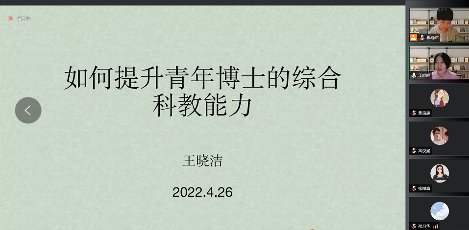 4月26日晚,bg大游官方网站经理王晓洁教授于线上作了题为“如何提升青年博士综合科教能力”的学术讲座。讲座由bg大游官方网站副经理仇晓洁主持,公司师生50余人参加。