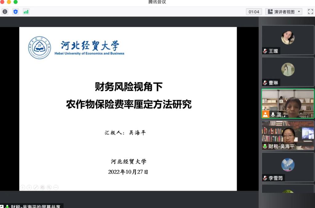 10月27日下午,bg大游官方网站利用腾讯会议举办了以“财务风险视角下农作物保险费率厘定方法研究”为主题的沙龙活动。本次沙龙活动由温立洲副经理主持,吴海平老师主讲,郝江华书记、王晓洁经理以及财税公司全体教师以及其他公司部分教师参加了此次活动。