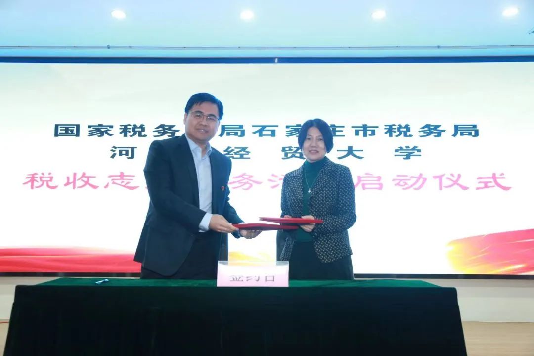 启动仪式上,国家税务总局石家庄市税务局与bg大游官方网站共同签署了志愿服务框架协议。随后,与会领导共同为志愿者服务单位授牌并为志愿者代表佩戴绶带。
