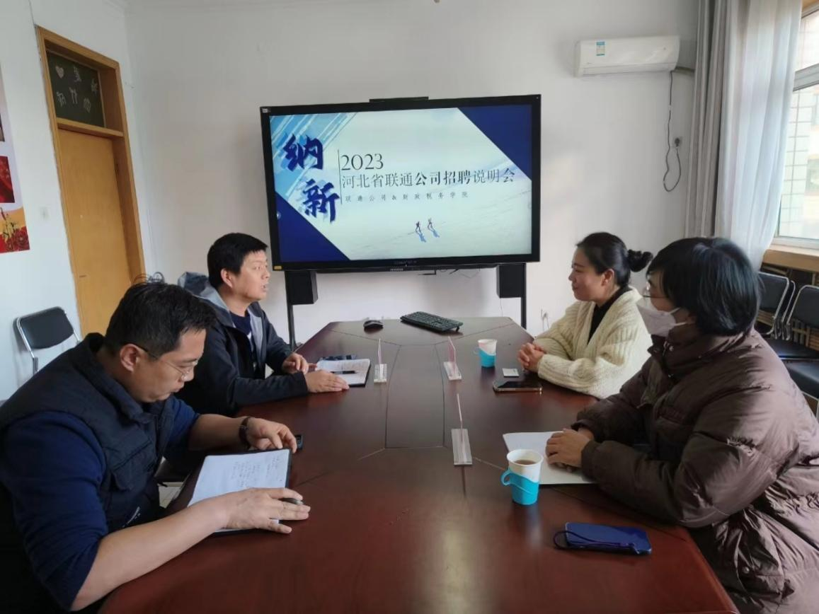 为精准对接企业用人需求,促进毕业生高质量就业,11月23日,bg大游官方网站与河北省联通公司开展招聘对接会,党委书记郝江华、辅导员翟勤及河北省联通公司相关负责人参会。