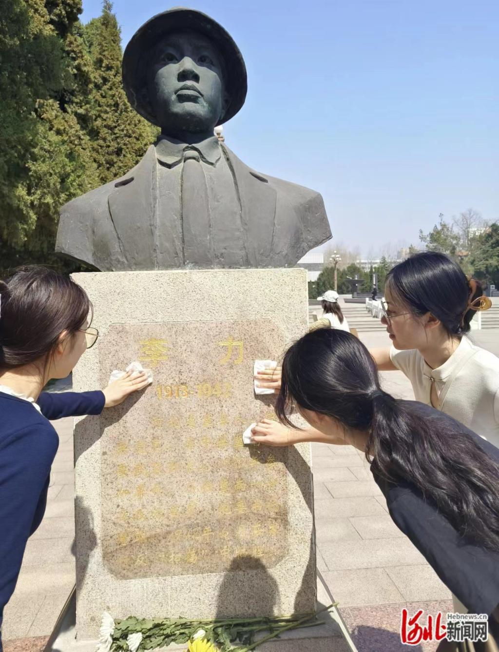 在烈士陵园,同学们肃立、默哀、鞠躬,向长眠在此的烈士致敬。员工代表讲解了白求恩、柯棣华、马本斋等6名英烈的革命事迹,同学们用自带的手帕认真擦拭烈士墓碑和雕塑,表达对烈士深深的敬意和缅怀。