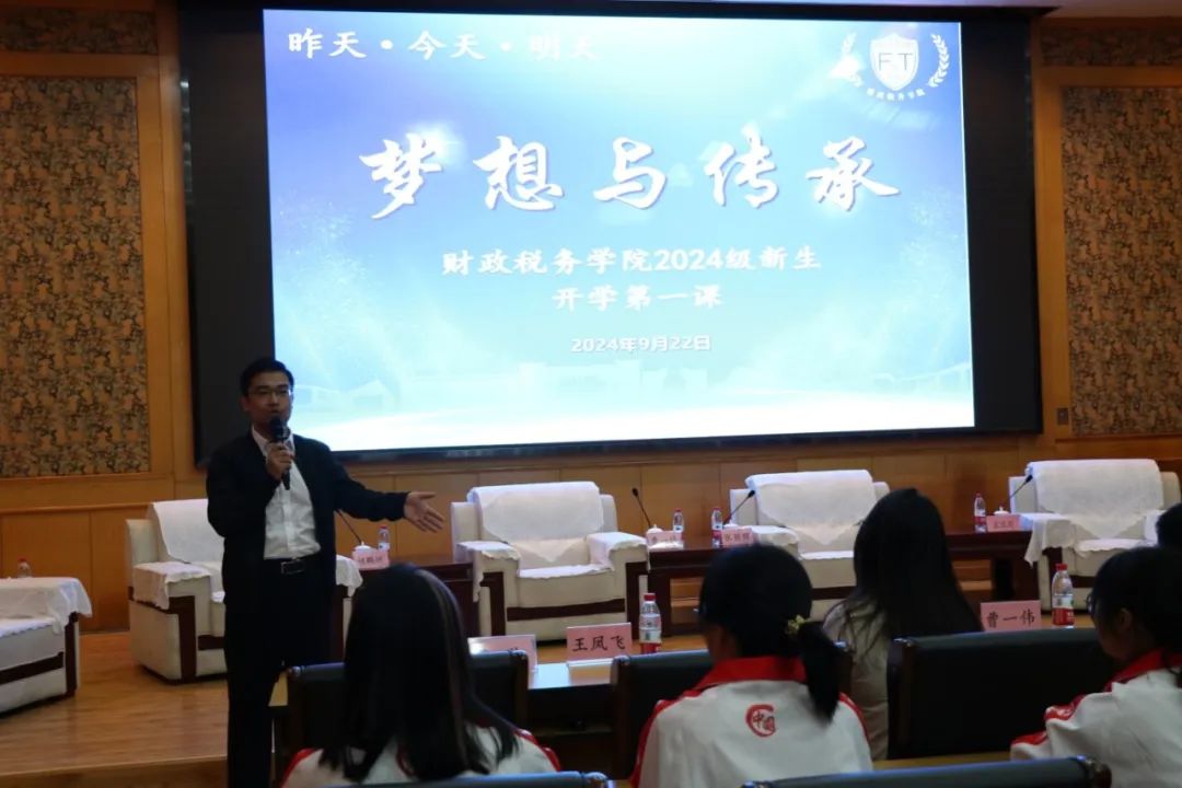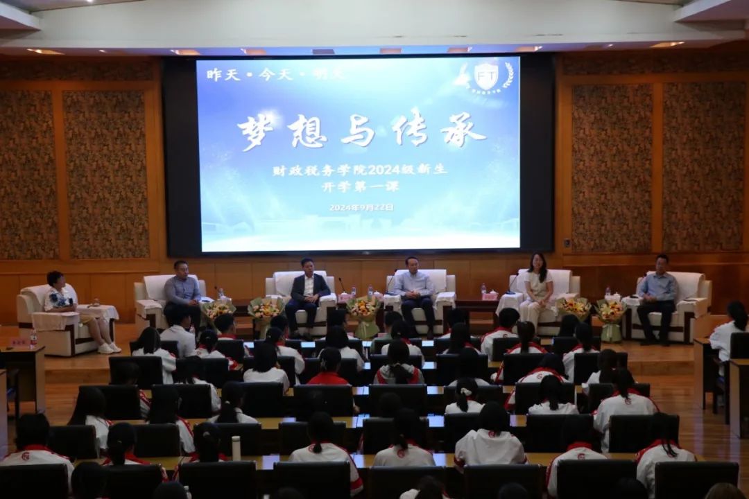 2024年9月22日,公司举办了以“昨天·今天·明天—梦想与传承”为主题的“开学第一课”。河北省公安厅经侦总队政办室主任张丽晖、bg大游就业指导服务中心主任曹一伟、通联支付网络服务有限公司天津分公司总经理胡鹏洲、河北省税务局税收科学研究所副所长于晓成、河北政法职业公司财税法务系主任宋瑞莉等五位员工嘉宾出席,公司党委书记、管理学博士王凤飞教授、公司党委副书记陈运涛、税务专硕导师组组长李金荣教授和新生辅导员魏芳及2024级全体同学参加。本次活动由曹琳教授主持。