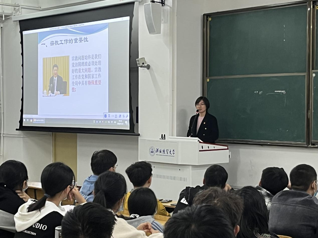 胡卓理指出,宗教问题是我们党治国理政必须处理好的重大问题,宗教工作在党和国家工作全局中具有特殊重要性。大学时期是一个人确立世界观、人生观、价值观的关键阶段,作为人才培养基地,高校引导同学们正确了解宗教知识,是职责所在。大公司园要认真贯彻执行党的宗教政策和方针,坚持马克思列宁主义,坚持辩证唯物主义世界观,主张无神论,共产党员、共青团员都不能信仰宗教。她分别从宗教概念、宗教的社会作用及马克思主义政党的基本态度和原则三个角度,重点介绍了马克思主义宗教观。