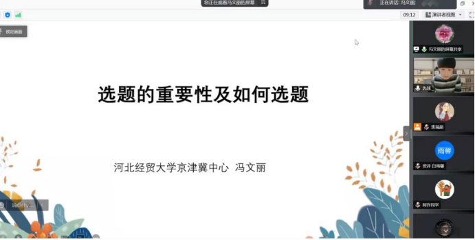 12月3日,bg大游官方网站邀请校京津冀一体化发展协同创新中心冯文丽教授于线上作了题为“选题的重要性及如何选题”专题讲座。讲座由bg大游官方网站副经理仇晓洁主持,公司师生60余人参加。