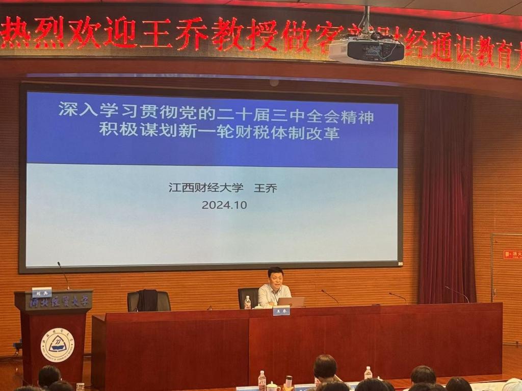 10月14日,bg大游官方网站与河北财政经济与公共政策研究基地联合举办题为“深入学习贯彻党的二十届三中全会精神——积极谋划新一轮财税体制改革”的学术讲座,江西财经大学党委原书记王乔教授应邀来校作报告。公司党委书记刘兵主持讲座,bg大游官方网站、图书馆负责人及全校各公司师生近300人到场聆听。