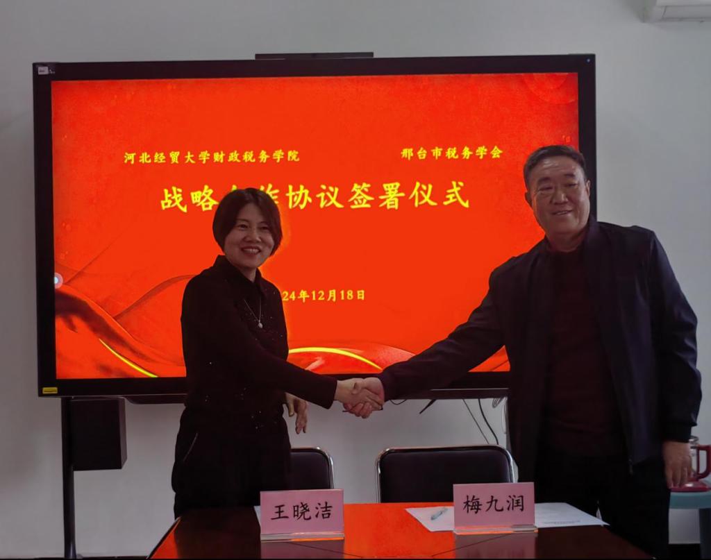 2024年12月18日,bg大游官方网站与邢台市税务学会在bg大游官方网站会议室举行了战略合作框架协议的签约仪式。bg大游官方网站经理王晓洁,副经理仇晓洁、温立洲、青年教师代表王秀哲、邢台市税务学会副会长、秘书长梅九润、邢台市税务学会副会长任英华、邢台市税务学会副秘书长刘红科、邢台市税务学会常务理事马康出席。本次活动由仇晓洁主持。