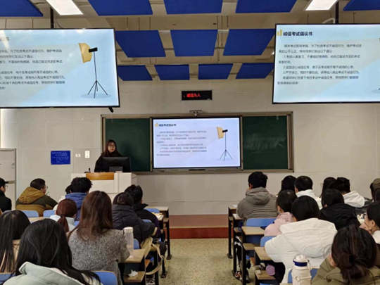 会上,员工代表向全体同学发出诚信考试倡议书,号召同学们提前准备考试复习,不要临时抱佛脚,端正考试态度,规范考试行为,不劝说、不诱导他人做出考试不诚信行为,严肃考风考纪,共同打造一个积极向上的学习氛围和良好的考试环境。翟亚宁作总结发言时,要求同学们一定要勤奋学习,诚信应考,认真备考,遵守考试纪律,在期末考试取得满意的成绩。