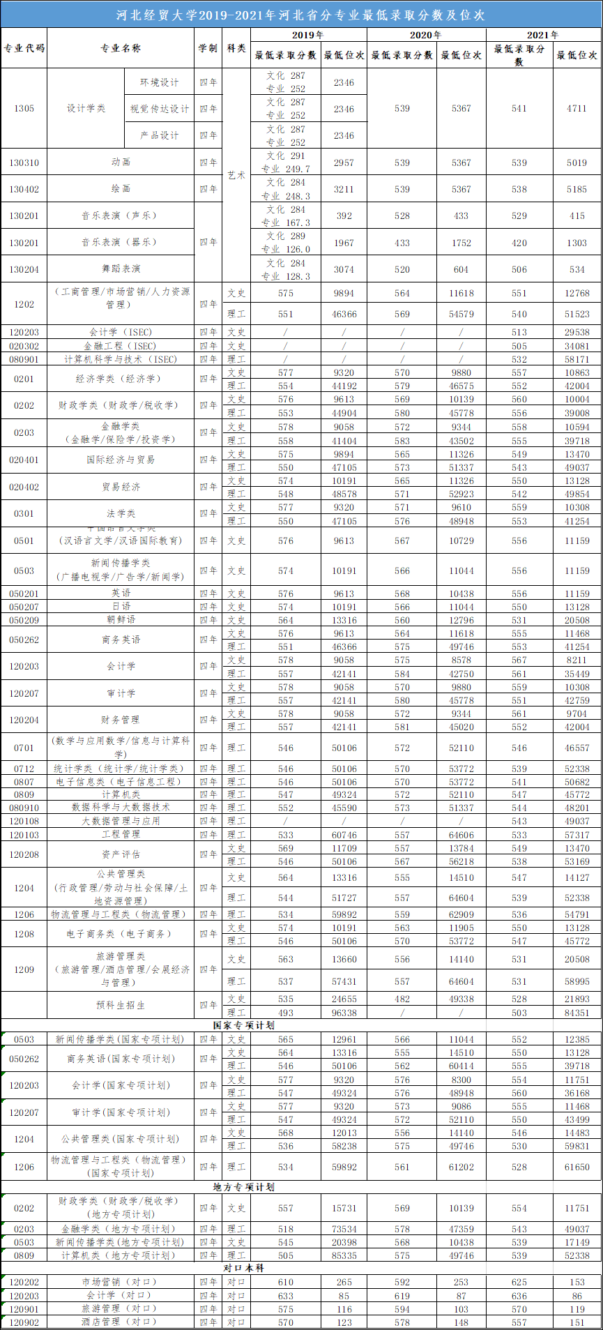 为方便各位考生填报志愿,公司现公布2019年—2021年河北省内分专业录取最低分数及位次情况,见下图: